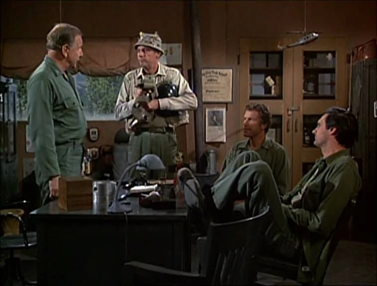 The Stars and Stripes blames it on the Chinese. That this aired at the time that Watergate was being increasingly revealed, and Nixon's presidency was increasingly unraveling, may not be coincidental, and the way it plays out feels more '70sish than '60sish. The government feels that if they rebuild the village (including with soft-serve ice cream and indoor plumbing) than they don't need to admit that they caused the damage. Hawk and Trap disagree, and then find out that if they have a record as trouble-makers, that will follow them stateside. As with Klinger not wanting to be labelled a homosexual, they cave in.