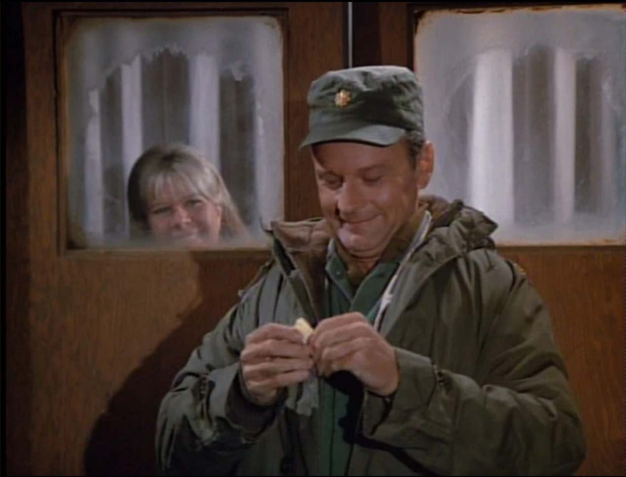 Gelbart, Greenbaum, and Fritzell wrote this hour-long episode in which Hawkeye finds out that Trapper is on his way home, and his replacement, 28-year-old B.J. Hunnicut, is arriving. So Hawkeye goes with Radar to the Kimpo airport. He just misses Trapper. (Wayne Rogers, according to IMDB, is uncredited as the Man on the PA in Kimpo.) But he does meet with and spend most of the rest of the episode bonding with B.J., who's new to Korea but soon loses much of his shininess. Meanwhile, Frank is in nominal command, although Margaret seems to be signing the papers.