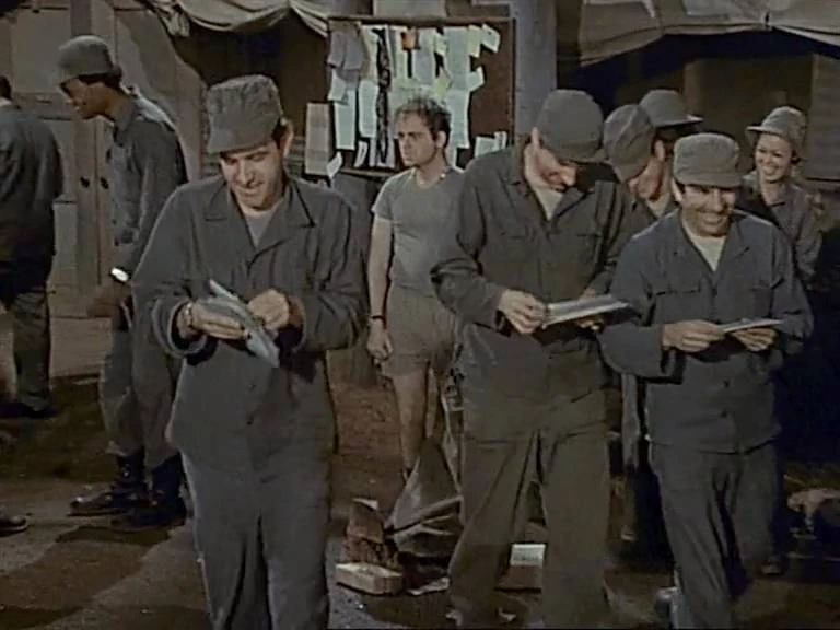 This Gelbart and Marks story, the first of 31 directed by Alda, has the characters receiving post and packages from back home. Henry seems very surprised that his wife Lorraine wants him to balance her checkbook, even though this came up on a previous episode. At least they're consistent about Trapper's family, since his daughters are still named Becky and Kathy, as in the episode "Kim." He misses them so much that he considers desertion, although Hawkeye manages to stop him. Meanwhile, Hawkeye and Trapper trick Frank into getting excited about a nonexistent stock, which leads Margaret to think he can afford to divorce his wife, although Frank would prefer to have Hot Lips as a kept woman back home. Oh, and Hawkeye is supposed to be 6'2" but he looks more than an inch shorter than Trapper, who's previously been mentioned as 6'3". (Alda and Rogers are those heights though.)