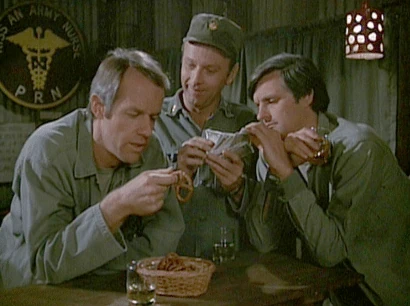 In this Greenbaum & Fritzell story, Frank falls apart in Margaret's absence even more than Gabe Kotter does in Julie's that same evening. Like Gabe, he goes through loneliness and jealousy, and he plays poker. He also gets very drunk, admits to a crush/lust on Nurse Kellye (Kellye Nakahara), and gets taken away as a patient to an aid station.