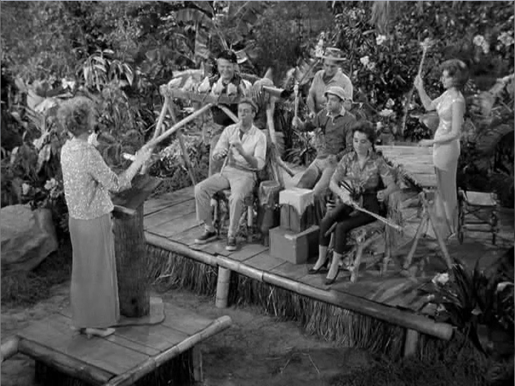 Mrs. Howell, who in the previous episode missed high society events, here starts an orchestra among the castaways. Unfortunately, natives at two of the neighboring islands think Gilligan is playing war drums. Not as racist as it could be, the episode, written by Al Schwartz and Howard Harris, has some funny moments*, and I like the band. Russ Grieve again plays a native, not necessarily the same one as before, while Frank Corsentino, who's also a native, would be a tailor on Soap. (I'm not tagging them though.)