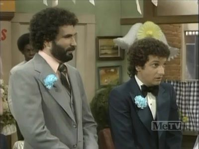 Perret & Richmond also wrote this part (or like I said, it might've all aired as a one-hour special) and, despite an unfunny section where Arnold's friends go looking for him after they scare him about being unable to support Mary, it's on the same level as Part One. It's good to see Mr. Kotter back (Kaplan in his Fast Break beard) and good to see Juan in drag at the bachelor party held at Vinnie's. (Vinnie is working late at the hospital. Travolta wasn't coming back.) Note that Mary's Uncle (according to the credits) gives her away, and we have no idea how any of their parents feel about the wedding. But Gabe is avuncular as always, even giving his wedding ring for the ceremony.